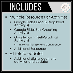 This bundle includes activities about proving triangles congruent, angles of triangles, distance and midpoint, areas of circles, and more. It includes all the digital resources/activities listed below and it will be updated to include all new geometry digital resources. This means you are not only getting these resources at a great price you are getting any future resources for free.