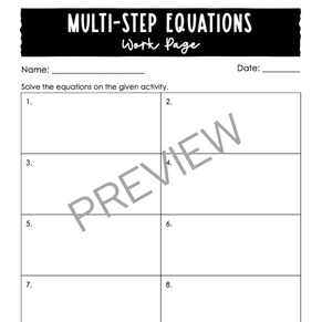 This is a Multi-Step Equations Task Cards Activity that includes a paper version and a self-checking google sheets version. It comes with a work page and an answer key. There are 20 multi-step equations to solve. None of the equations include fractions.